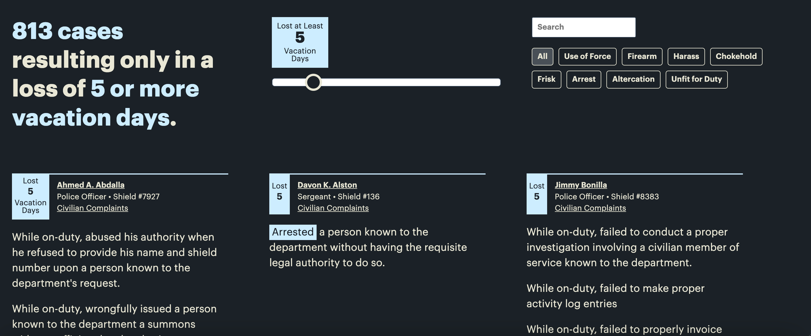 I looked into a few Data Visualization blogs: ProPublica, FiveThirtyEight, and FlowingData. Data is the most effective when it has a simple to understand interface but visually striking in order to get across the gravity of the data. One such visualization is on the ProPublica article “New Records Show the NYPD’s Favored Punishment: Less Vacation Time” by Moiz Syed and Derek Willis. The article itself has less than 400 words because the data speaks for itself. The article has organized 1300 complaint cases of NYPD officers who received punishment via lost vacation days. It gives the reader a few ways to search: you can directly search the officer by name and find their badge number, complaint, and the amount of vacation days said officer lost. One can also search by incident with buttons labeled “arrest”, “force”, “frisk”, “chokehold” as not each case has the same amount of days taken away. Finally, you can use a sliding scale of vacation days lost. For example, if you scrolled to “5 vacation days lost” it would list all the cases with overhead caption “813 cases resulting in only a loss of 5 vacation days” and the only speaks volumes. It presents seemingly overwhelming data easily. It gives the reader a grim realization that the NYPD gives officers with multiple complaints essentially a slap on the wrist with lost vacation time and that it is not an isolated issue. It gives people who may have made these complaints an easy to use database to see how their voice was heard or really not heard.